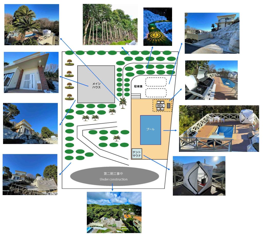 青空にさえる白を基調とした外観、大面積のウッドデッキには、大型プール、本格的BBQグリル、薪ストーブのテントサウナを配し、芝生やココスヤシに囲まれた立体的なステップガーデンもご好評です。